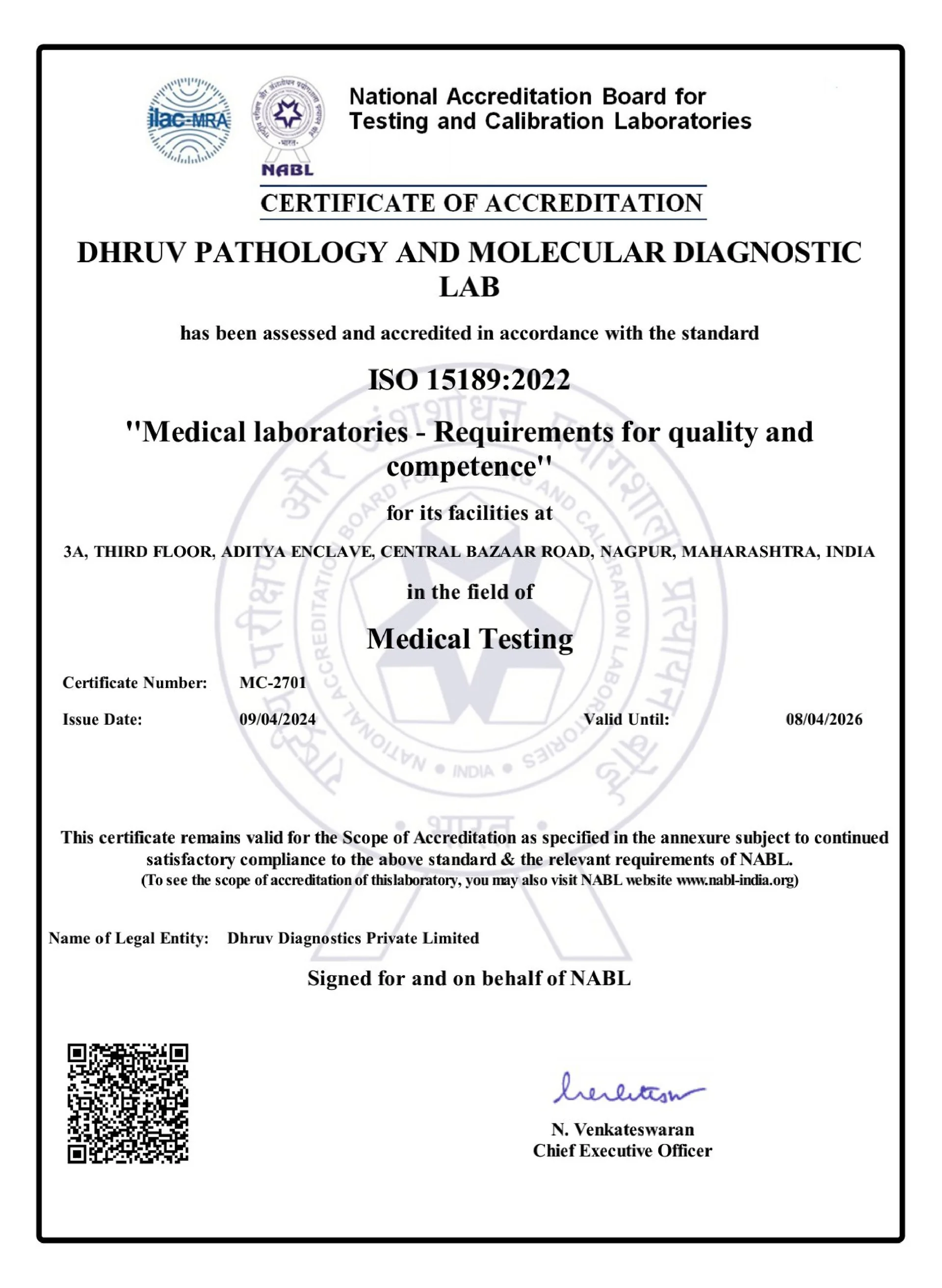 Dhruv Diagnostics is proud to be accredited by the National Accreditation Board for Testing and Calibration Laboratories (NABL) since 2011. NABL is the premier accreditation body in India, governed by ISO 15189:2022 standards for Medical Laboratories – Quality and Competence.